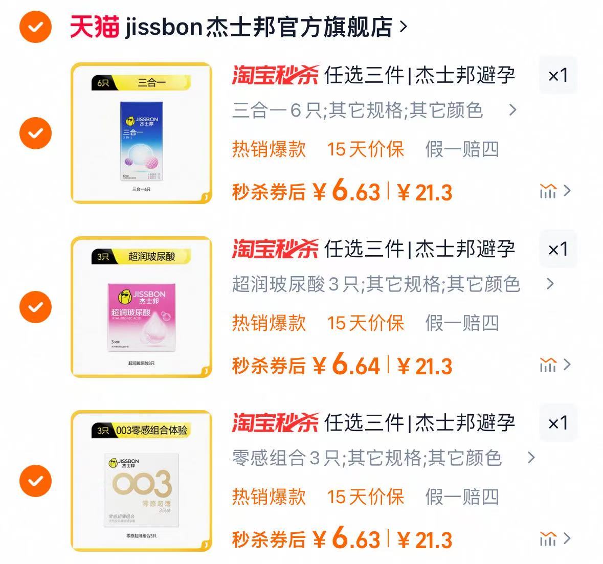 天猫热销榜 速度抢! 杰士邦官旗•避孕套组合 最多到手18只19.9亓88vip到手18.9亓 折1亓/只,全程隐私发货!!进口超薄系列! 去药店买先不说尴尬的事,就说那价格都让人流泪